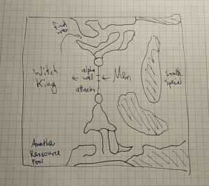 I already included some other landmarks such as a second ressource pool and a “special place” which often tells a little hidden side story. I also tried to sketch the layout in such a way, that it is similar to other maps in the game: A lot of corners and paths to explore.