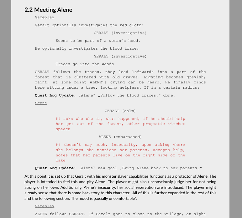 As you might notice, I dumped the Gameplay/Scene regular headers and incorporated them into the screenplay. I oriented in screenplays used in film, but didn’t follow the exact formats often used there. Normal text like the one close to the bottom of the image is meta-information: It talks about goals, mood, the player and story construction. I also marked quets log updates, decisions and unfinished dialogue in a special way.