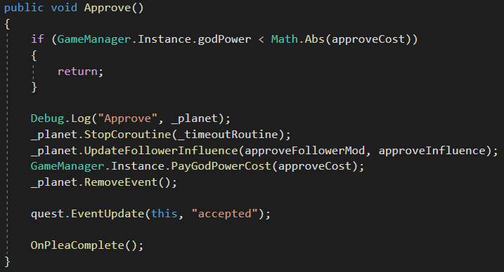 In the game, I let a class Plea derive from QG_Event and add three endings: “accept”, “deny”, “timeout”. When a player hits e.g. “Accept” for a plea, then a method is called in Plea which updates the follower informtions etc. and calls an EventUpdate for this event on the quest it is assigned to.