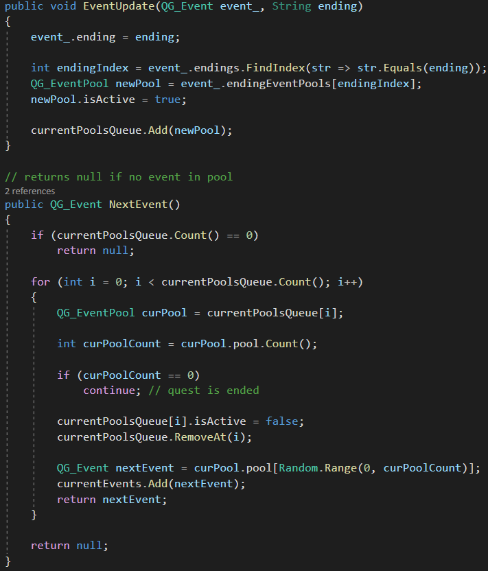 The quest class itself holds all pools and their event and manages initialization, event fetching and update, which can be summarized as progressing in the quest. Nodes/event pools, where the signal is, are marked as active and are hold in the currentPoolsQueue. Currently happening events are hold in currentEvents. When an event is updated to an ending, then the event pool belonging to that ending is added to the end of the currentPoolsQueue. When a new event is requested, an event is chosen from the first (= being the longest in the queue) event pool in currentPoolsQueue.