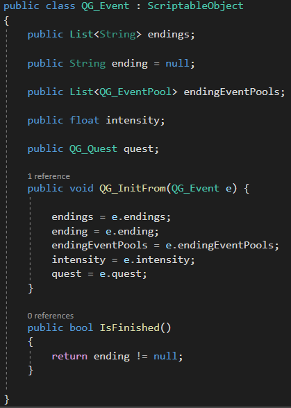 The basic unit of this system is the event, containing informations on the endings to which this event may lead, a list of nodes/event pools to which an ending might lead, a field to inscribe the event’s “felt” intensity (it is planned to do some automatized selection of events based on an ideal pacing graph) and a reference to the parent quest. Events, too, correspond to quest blocks, and also contain the connectivity informations.