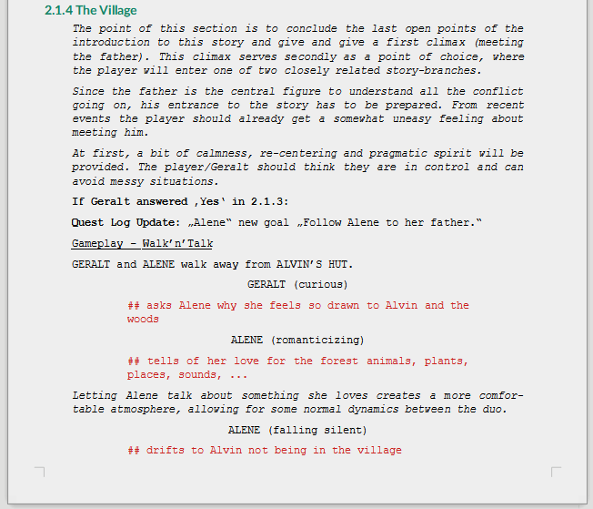 I’ve continued writing on the quest design document which I began earlier. To be precise, I concretized the section “The Village” which happens directly after Alene and Geralt’s meeting with Alvin. In particular, it comprises walking to the village and the introduction of the father, Aisker. At the end the most importnant decision of this quest has to be made – whether to get involved in family matters or not. Here are some screenshots of what I wrote (here is the full file):