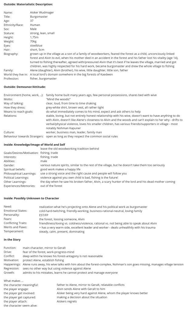 Already in previous posts I explained or hinted to the underlying conflicts happening in my Witcher quest. Today I’ll show a characterization of Aisker, Alene’s father, who is probably the central figure to understanding what is so wrong in the village and why we encounter Alene in the way we do.