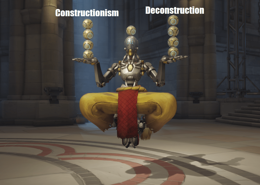 But there is hope! We come to deconstruction, which involves taking some constructed thing and not only just experience it as it is, but also look inside, break it, find its connection. Deconstructing doesn’t mean to destroy things, but to analyse it, doing a close reading and laying open what it is and why it is that. That allows for improving, refining. It is a safety mechanism for our faulty (but necessary) constructionist efforts.
