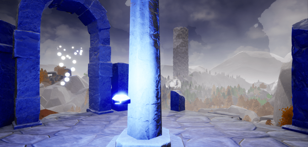 In the foreground is placed what is needed to be achieved first: Collecting the (blue) Ocularis relics. In the middle ground there’s an overview over the first stretches and landmarks from the game world – a hill on the left, a small tower with sphere in the middle, some sea with sphere on the right and a valley in the front where the player will pass through first. In the back ground the overshadowing Tower of Umbra can be seen, which will host the games final places and scenes.