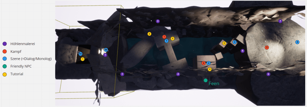 You start on the very left after a short fade in where Leonora monologues “Wh- Where am I? Who am I?”. This sets up the whole narrative and level progression. On the same time, the 3D model of avatar Leonora is seen, who is carrying armor, sword and bow. This prepares the player for being able to fight. The player starts in a small secluded chamber where she has some space to try out basic movement and some controls should she have seen the controls menue. Left and right in the chamber cave paintings are placed, encouraging the player to move towards them.
