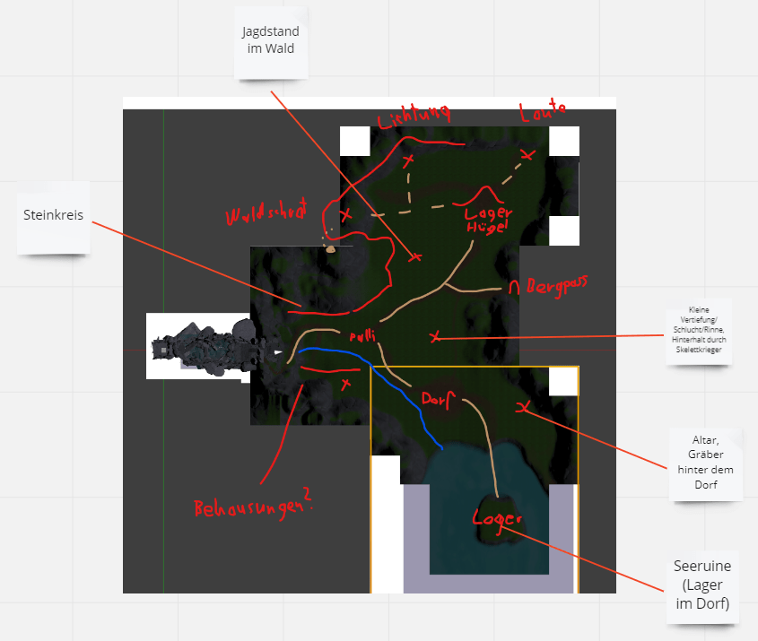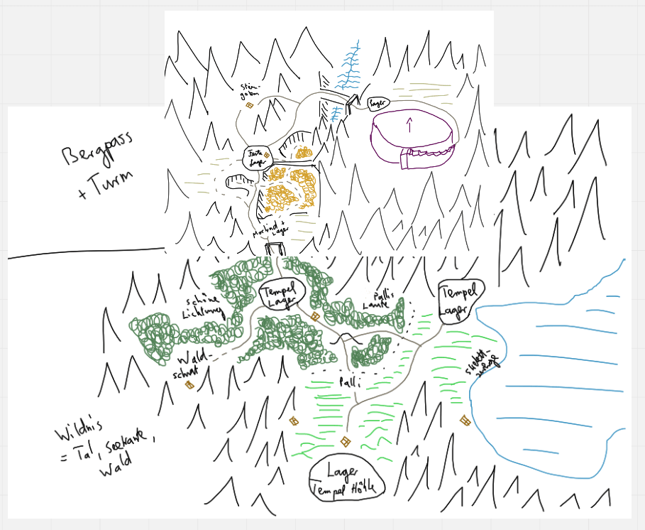 - a developed sketch of the map with all major elements roughly placed (we later moved e.g. the entrance to the mountain pass further to the right to archieve more of a balance between the two flanks)